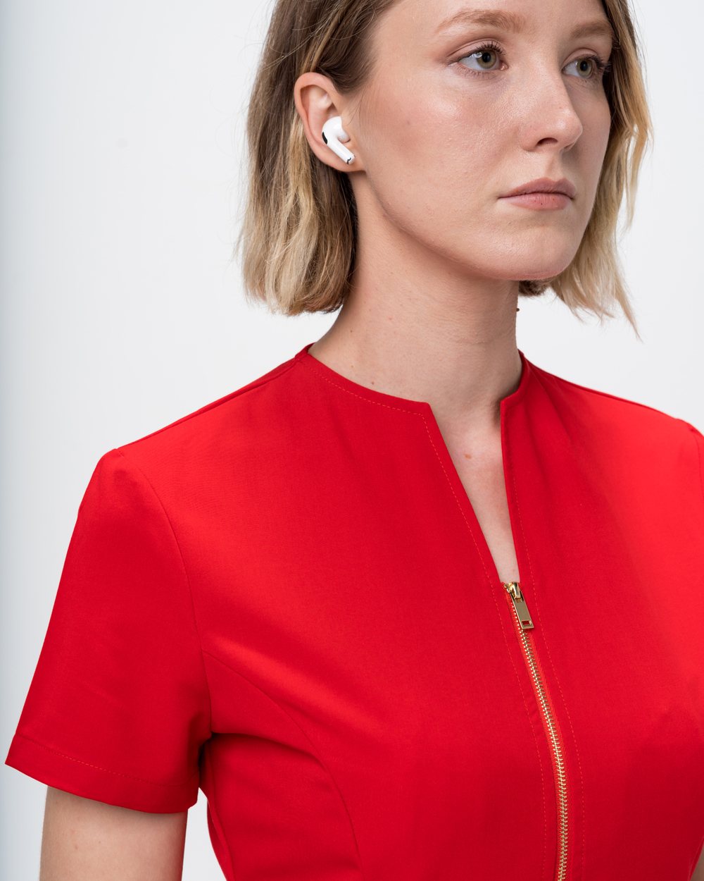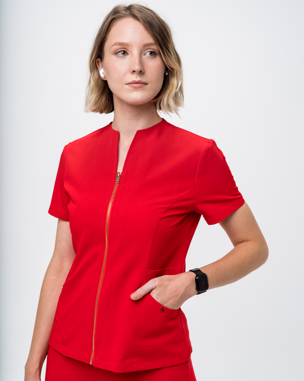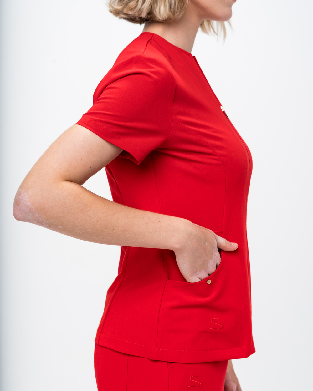 Un real trendsetter, Bluza medicala Donna vine cu 4 buzunare, croiala Slim Fit si fermoar metalic frontal.